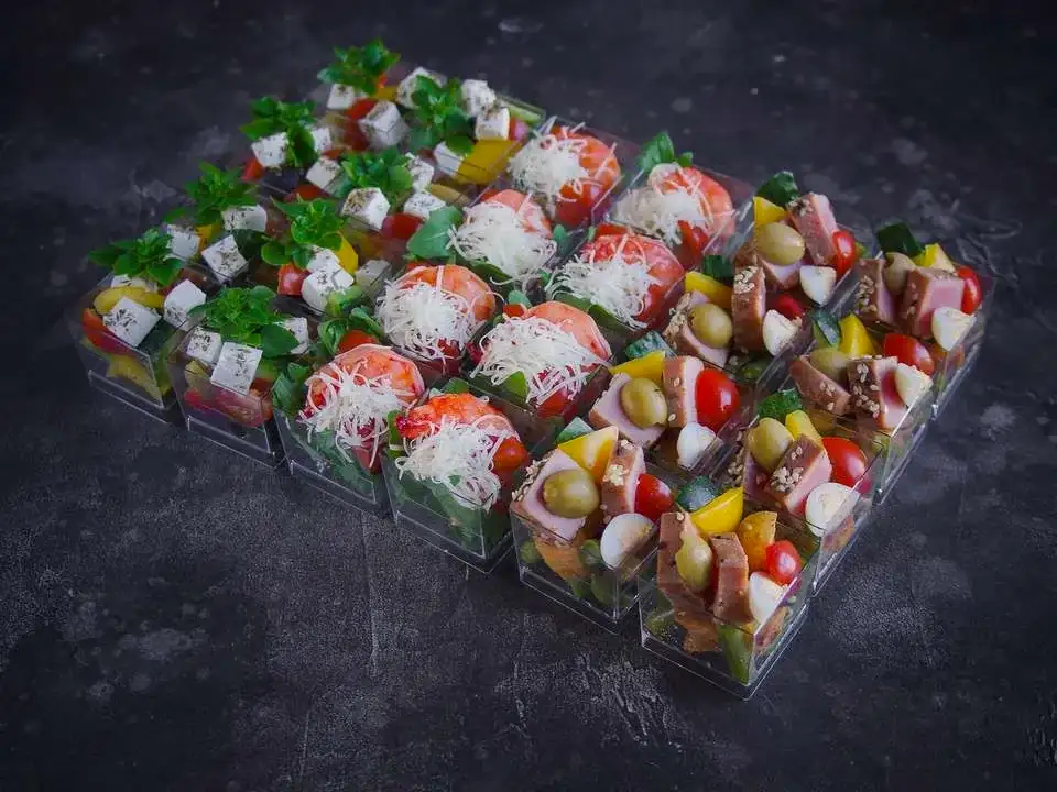 Салат Греческий - 8 порций по 50 г Салат Руккола с тигровой креветкой - 8 порций по 40 г Салат Нисуаз с тунцом - 8 порций по 50 г